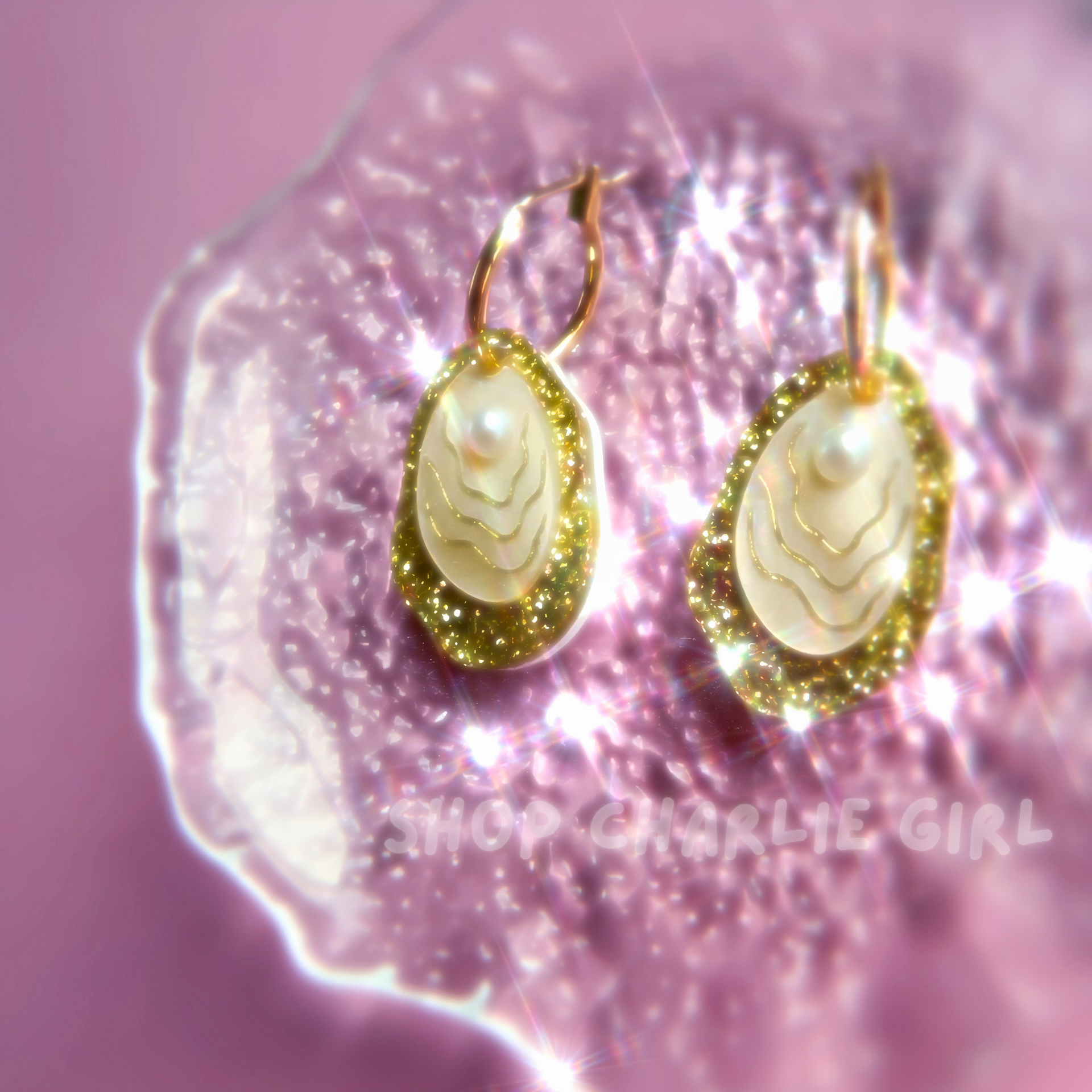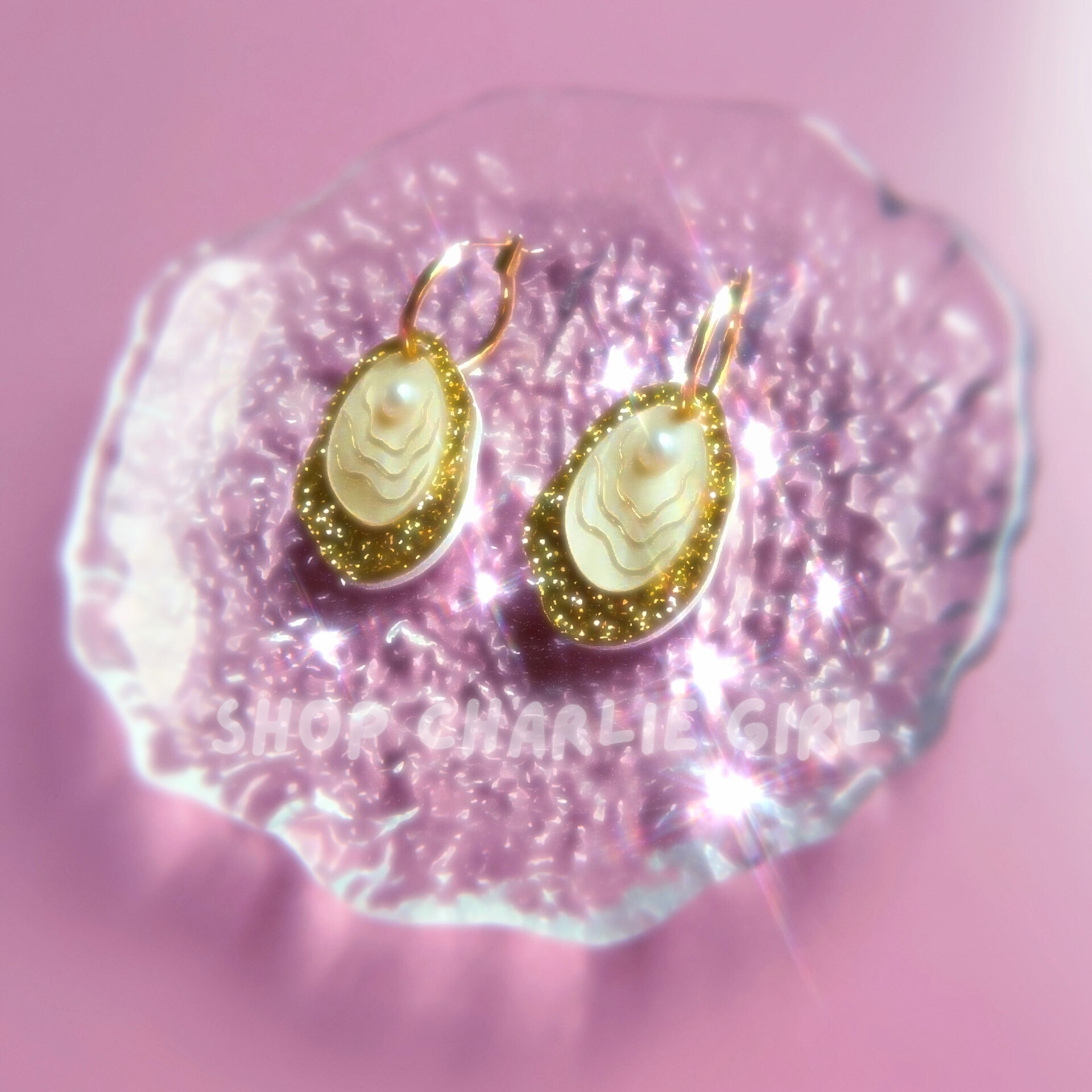 Handmade in our home studio with laser cut acrylic. This "golden" oyster design is the earring version of our best selling hair clip.